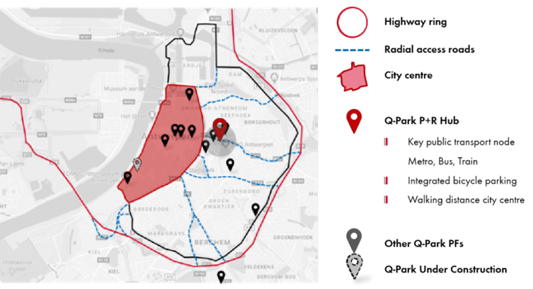 Q-Park dispose d'un réseau intelligent et connecté de Hubs de mobilité dans les principales villes d'Europe.